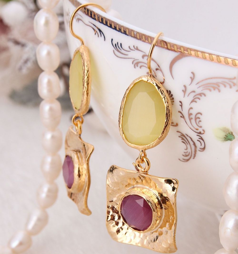 PENDIENTES DE BRONCE CON BAÑO DE ORO DE 14K. CON PIEDRAS PRECISOSAS