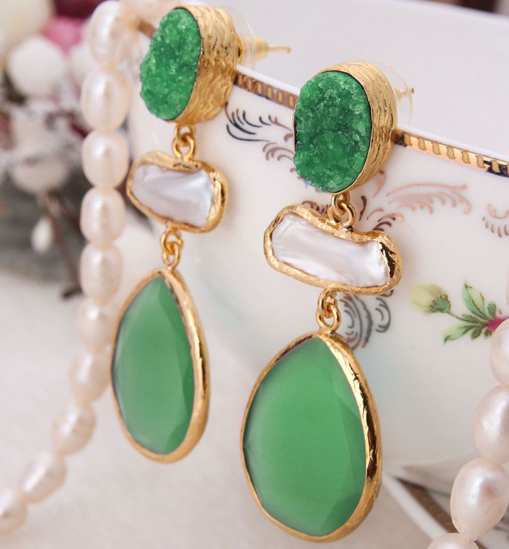 PENDIENTES DE BRONCE CON BAÑO DE ORO DE 14K. CON PIEDRAS PRECISOSAS