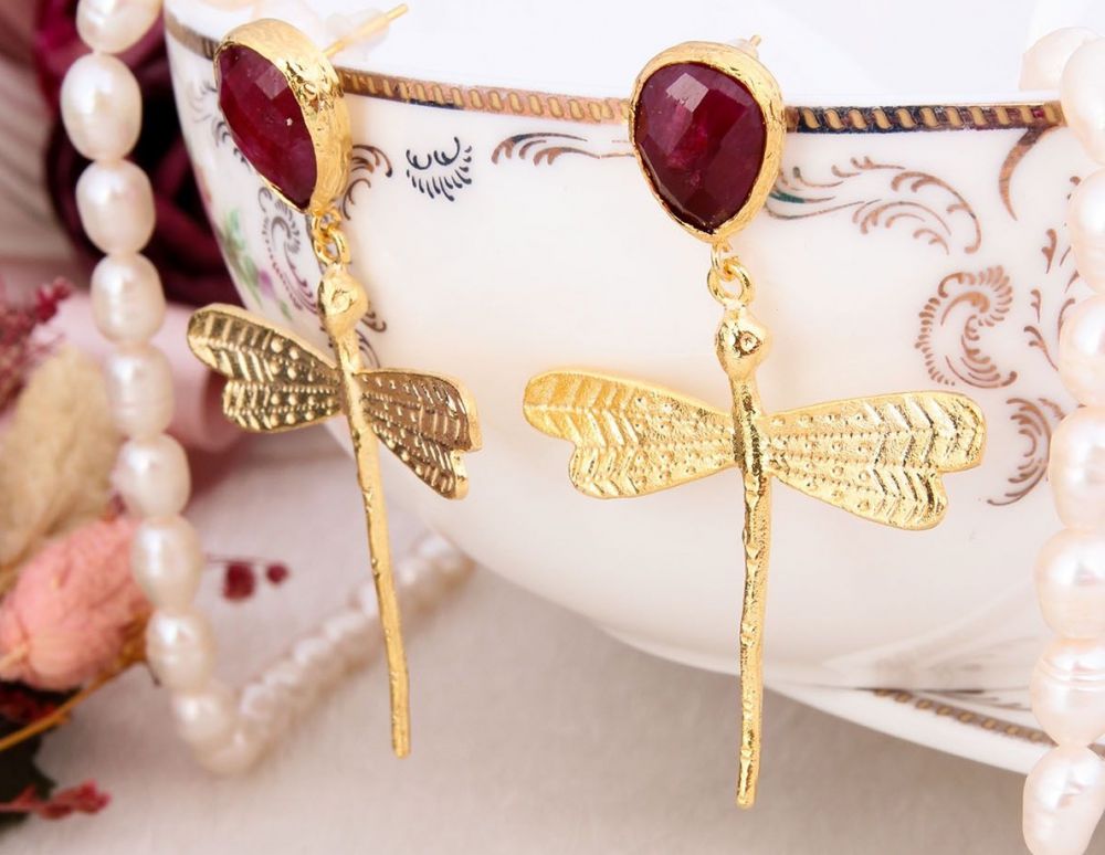 PENDIENTES DE BRONCE CON BAÑO DE ORO DE 14K. CON PIEDRAS PRECISOSAS
