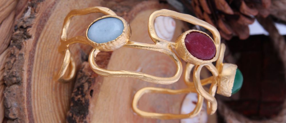 BRAZALETE DE BRONCE CON BAÑO DE ORO DE 14K. CON PIEDRAS PRECISOSAS