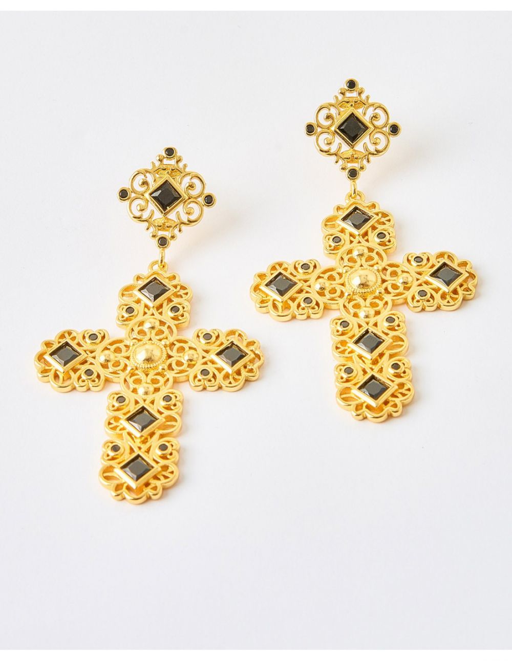 PENDIENTES ACERO CRUZ 8CM CIRCONITAS NEGRAS