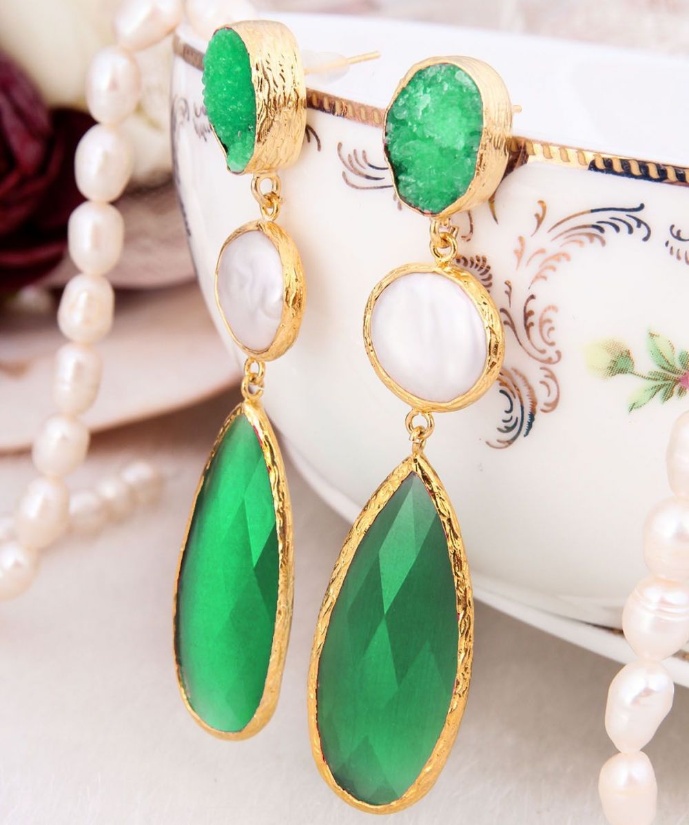 PENDIENTES DE BRONCE CON BAÑO DE ORO DE 14K. CON PIEDRAS PRECISOSAS