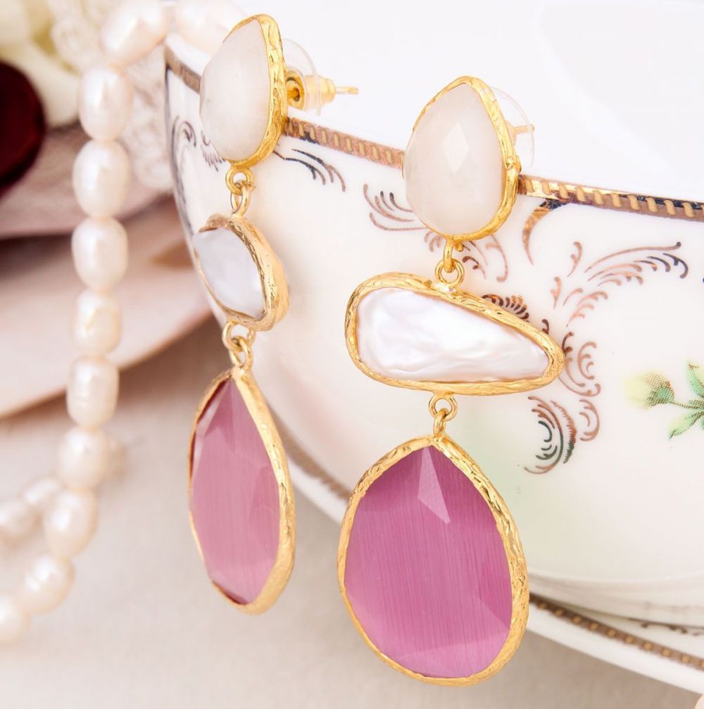 PENDIENTES DE BRONCE CON BAÑO DE ORO DE 14K. CON PIEDRAS PRECISOSAS